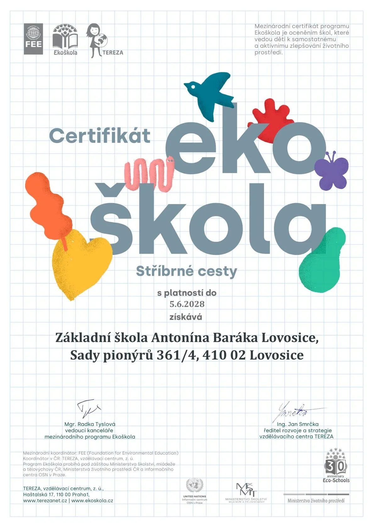 Děkujeme zákonným zástupcům, všem pracovníkům školy a Městu Lovosice za podporu a spolupráci při získávání certifikátu.