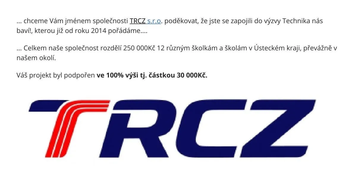 Naše škola získala významnou podporu pro projekt Technika nás baví 2025. Společnost TRCZ s.r.o. nám věnovala 30 000 Kč.