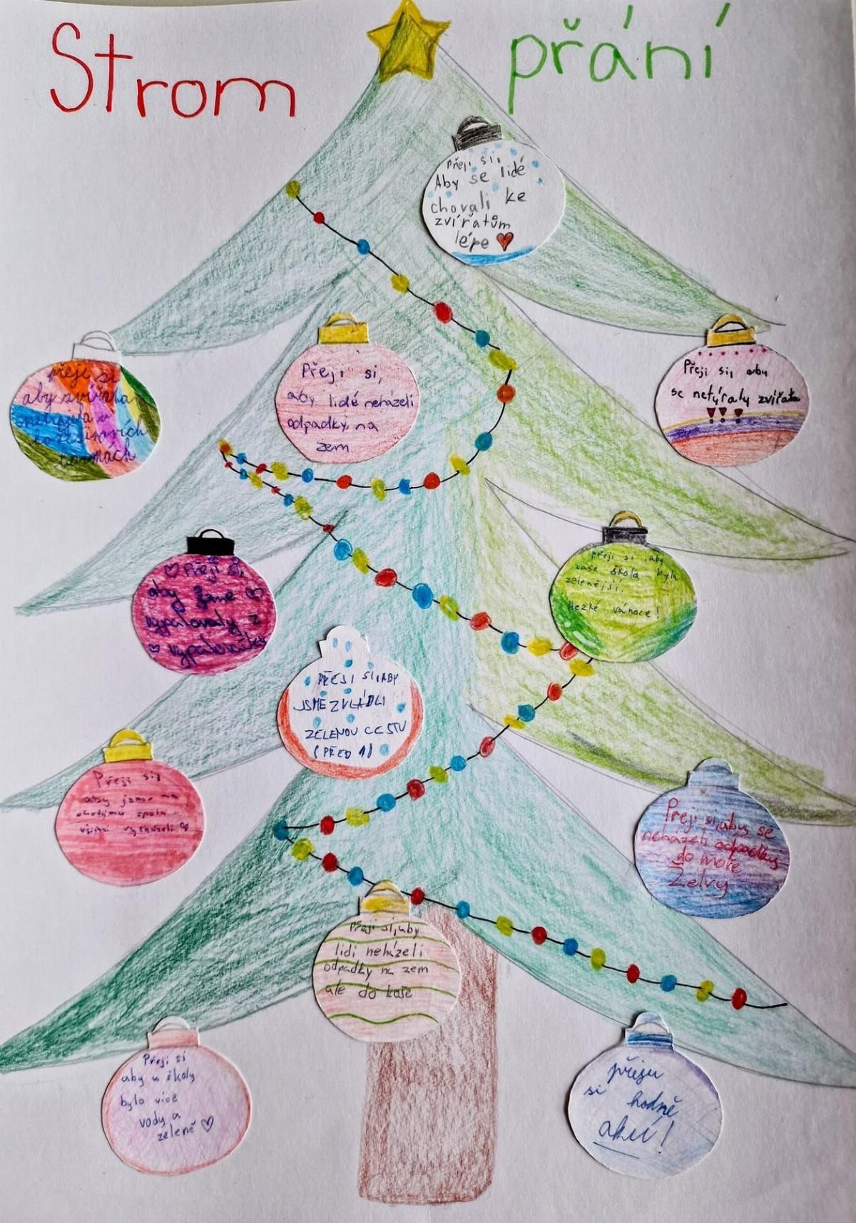 Na tomto netradičním stromě nejsou klasické ozdoby, ale myšlenky a přání věnované přírodě, škole i lidem kolem nás. Děti tak ukázaly, že Vánoce nemusí být především o dárcích, ale o ohleduplnosti, vzájemné pomoci a dobrých vztazích.