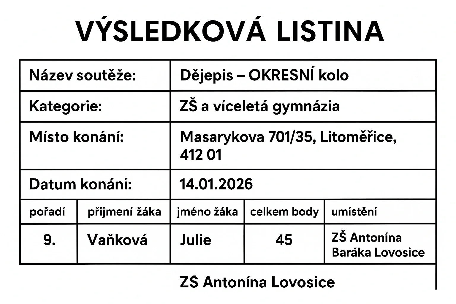 Julie Vaňková ze 7. třídy se v okresním kole dějepisné olympiády mezi 32 soutěžícími umístila na krásném 9. místě. O to větší úspěch je, že se této soutěže obvykle účastní hlavně žáci z 9. tříd.