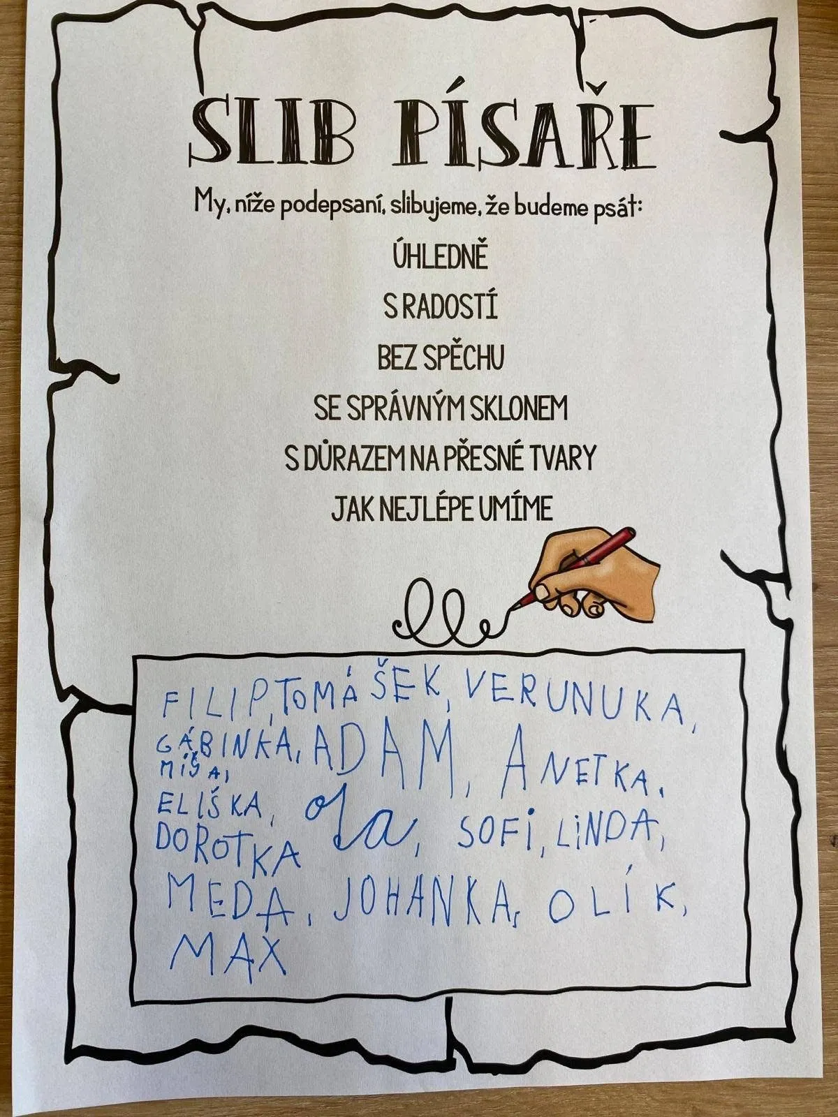 Naši nejmladší školáci z tříd 1.A, 1.B a 1.C dnes prožili opravdu výjimečný okamžik. Převzali si své úplně první vysvědčení a zároveň byli slavnostně pasováni na písaře perem. Nechyběl ani podpis slibu písaře, který si děti s hrdostí vyvěsily ve svých třídách.